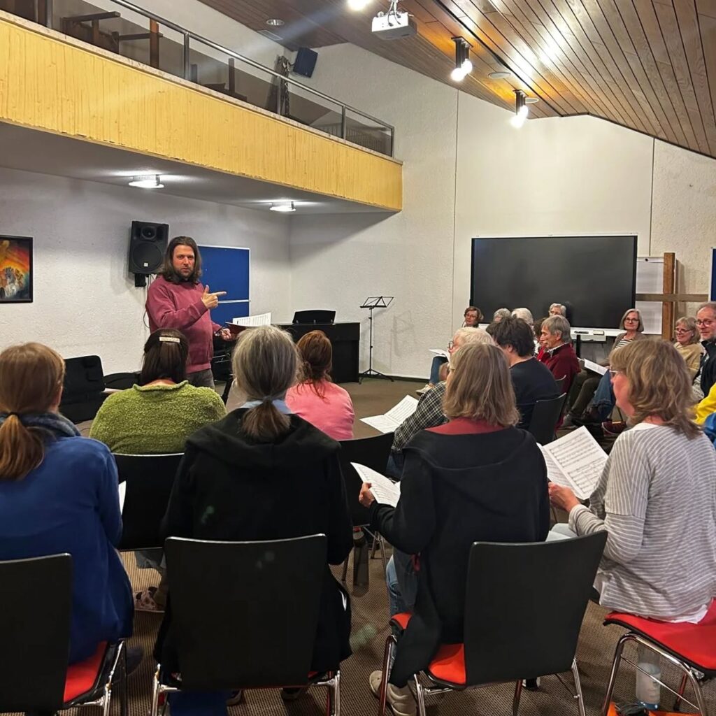 Alle Teilnehmenden mit unserem Dirigenten Dr. Michael Hucht und Coaching-Referentin Sarah Becker und einmal ein Ausschnitt aus der Probe am Freitagabend.